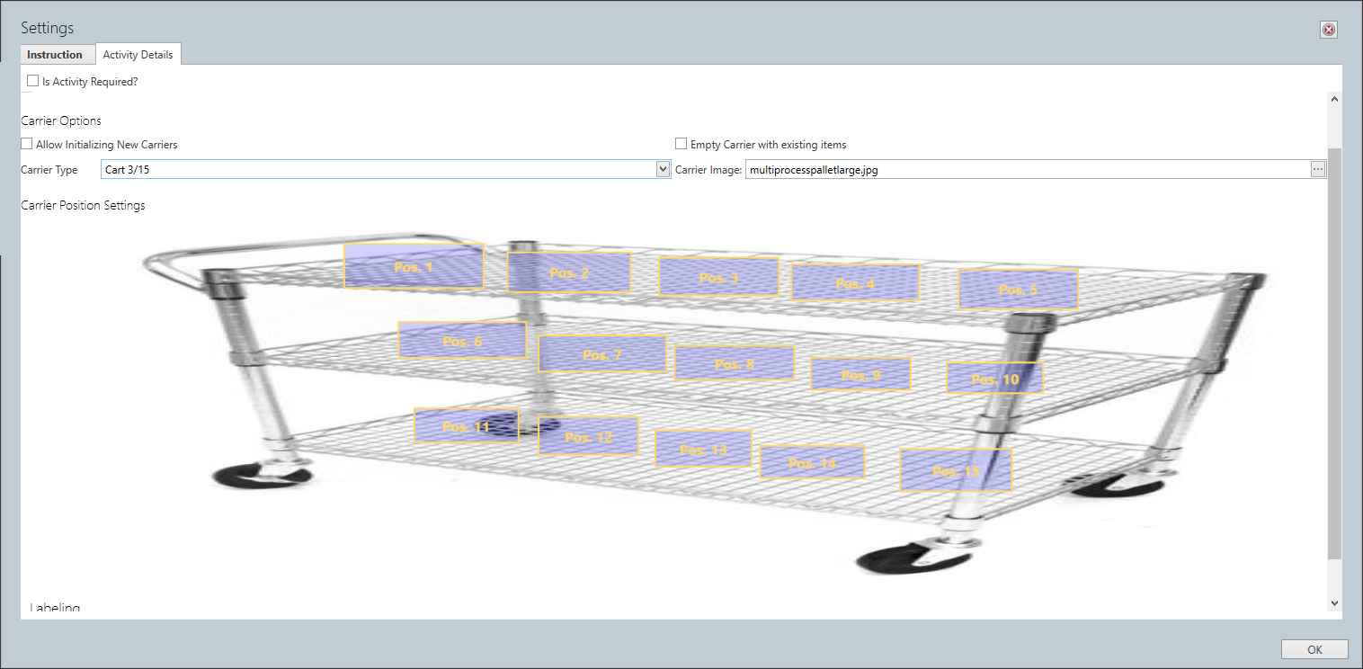 Wenn Sie die Optionen für die Aktivität Trägererfassung auswählen, können Sie ein Bild des Trägers hochladen und auf diesem Bild Positionen erstellen, die die Bediener unterstützen.