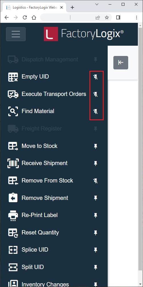 Angepinnte Elemente werden mit jedem Benutzerprofil gespeichert und stehen auf jedem Computer zur Verfügung, an dem sich ein Benutzer anmeldet, um auf Logistics zuzugreifen.