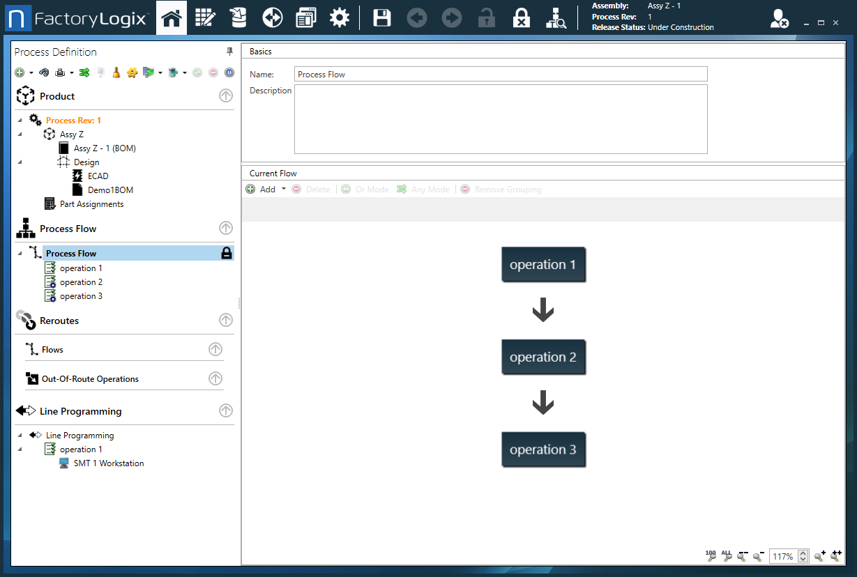 Ein Prozessfluss beschreibt die Vorgänge, die für den Zusammenbau erforderlich sind. Beispielsweise sind Schablonendruck, automatische und manuelle Bestückung alles Vorgänge in einem typischen SMT-Prozessablauf. Sie definieren Prozessabläufe im Fenster Prozessdefinition von FactoryLogix Office.