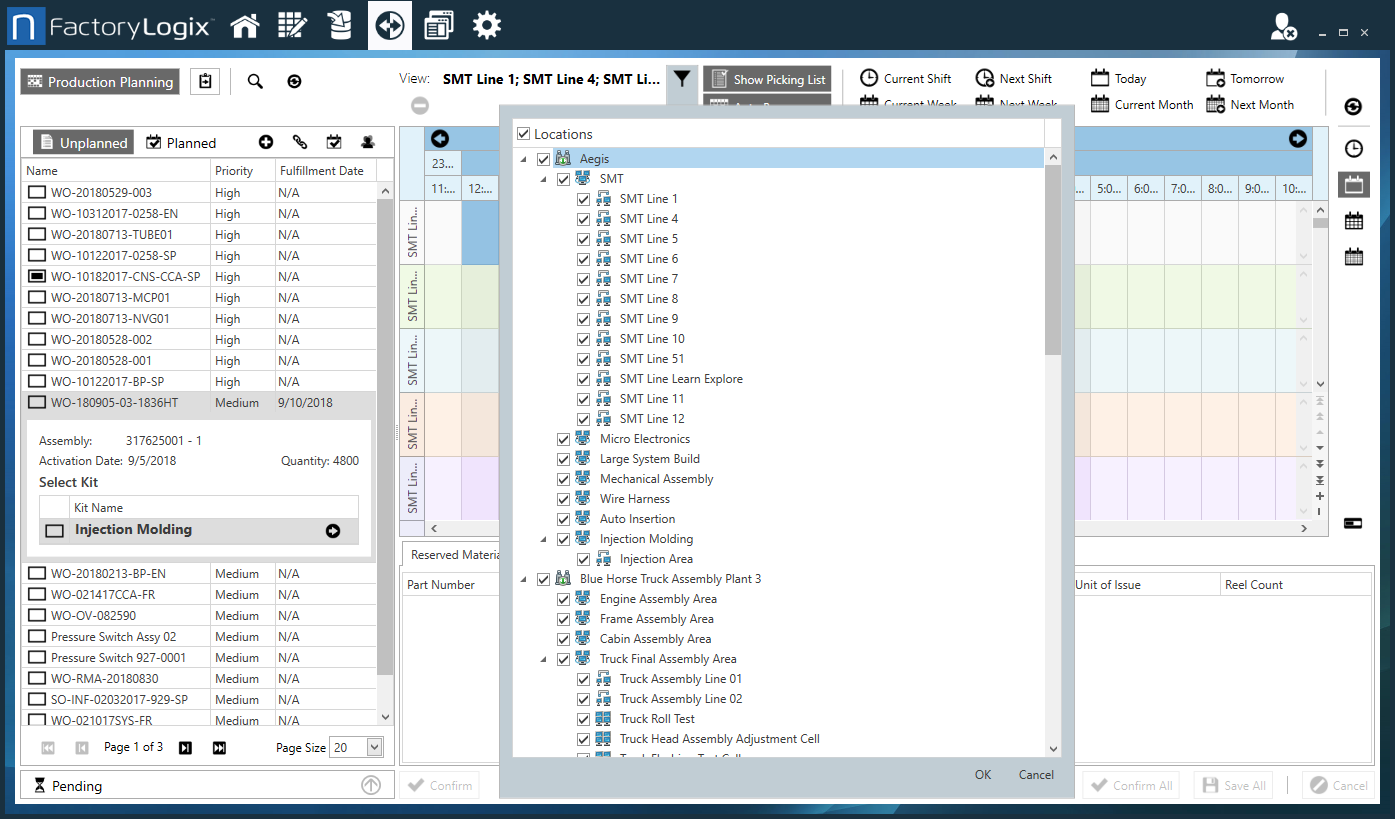 New production batches are added to the list on the left side of the Production Planning window as they are created with a default status of Unplanned. The batch list is sorted by priority, then by fulfillment date.Use the toolbar buttons at the top of the window to configure the Schedule view to show production planners one shift, one day, one week, or one month at a time.